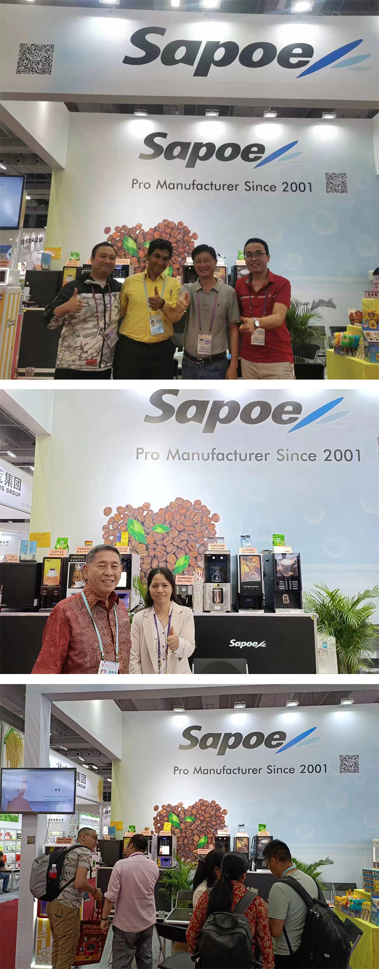 Sapoe The latest “Sapoe” brand automatic coffee machine, “Sapoe” brand automatic beverage vending machine, “Aurora” fresh-ground coffee machine, “Gioia” Vending machines for popcorn and tea are on display at the exhibition, by the majority of domestic and foreign customers, have ordered to take the prototype test, we received on-site customers at home and abroad more than 800,000 U. S. dollars, exceeding expectations.